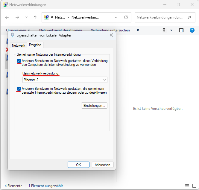 In dem neuen Dialogfenster finden Sie 2 oder meher Netzwerkadapter. Bitte wählen Sie jetzt den Netzwerkadapter A (mit Internet) aus und öffnen Sie die Eigenschaften. Wählen Sie anschließend den Tab “Freigabe” aus. Bitte wählen Sie alle Optionen aus und ggf. den Netzwerkadapter B. Sollten Sie nur genau 2 Netzwerkadapter haben, gibt es keine Auswahl und die Verbindung wird automatisch mit Netzwerkadapter B (lokaler Adapter für toolstar®bootcast) geteilt.