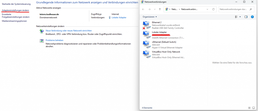 In Windows öffnen Sie als erstes die Systemsteuerung und Navigieren dort zu “Netzwerk und Internet” -> “Netzwerk- und Freigabecenter” -> “Adaptereinstellungen ändern”.